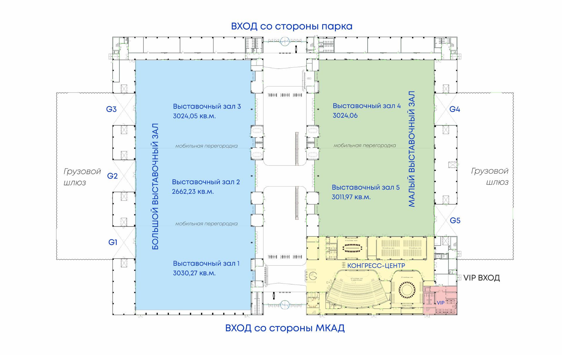 Состоит из выставочных залов 1, 2, 3, каждый из которых имеет независимую систему инженерии. Залы могут отделяться мобильными перегородками (звукопоглощающими, на всю высоту зала). Установка перегородок возможна только в обозначенном месте.